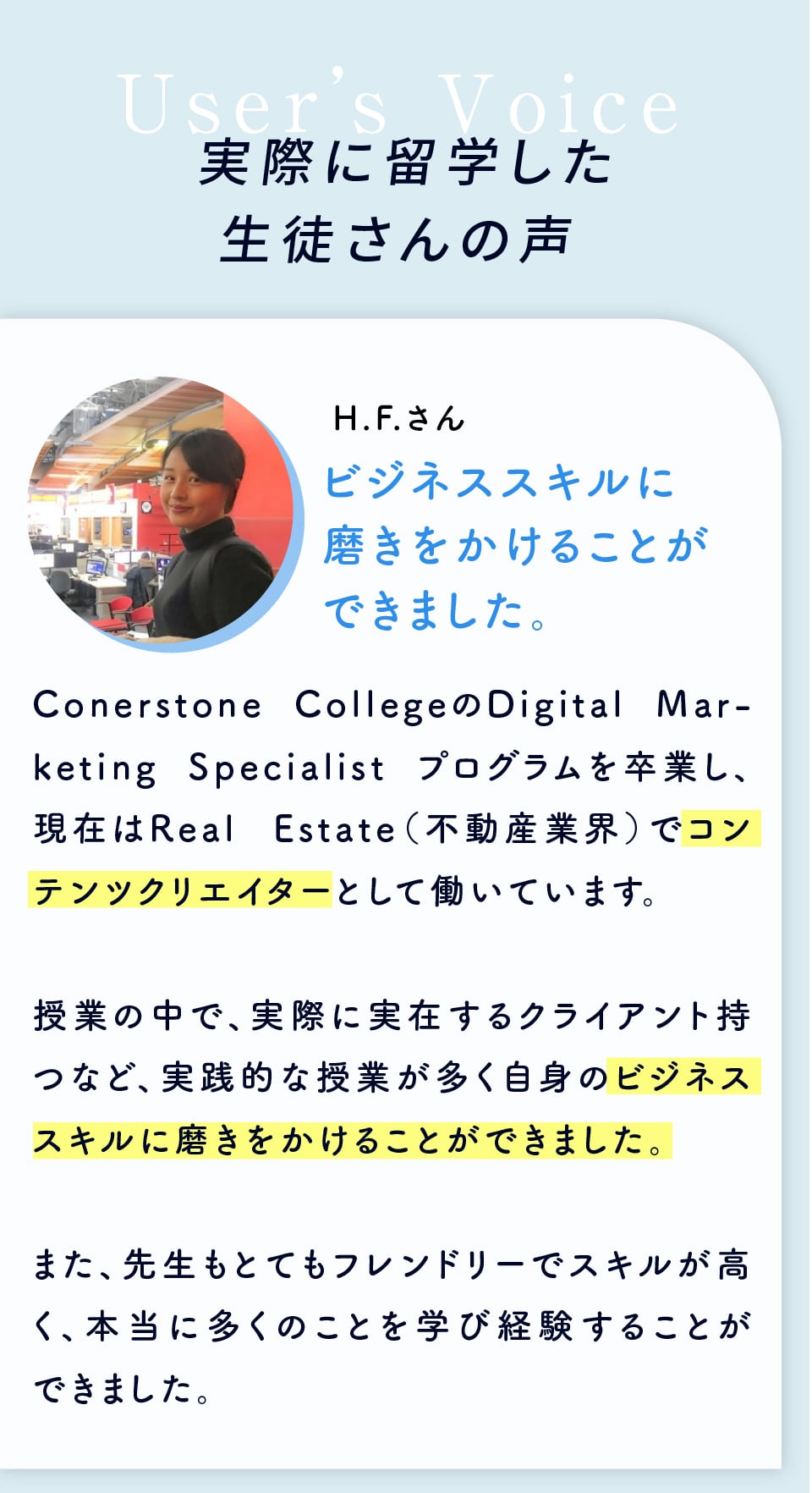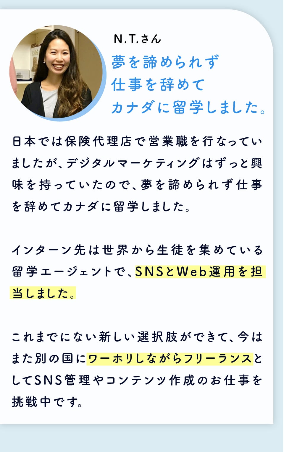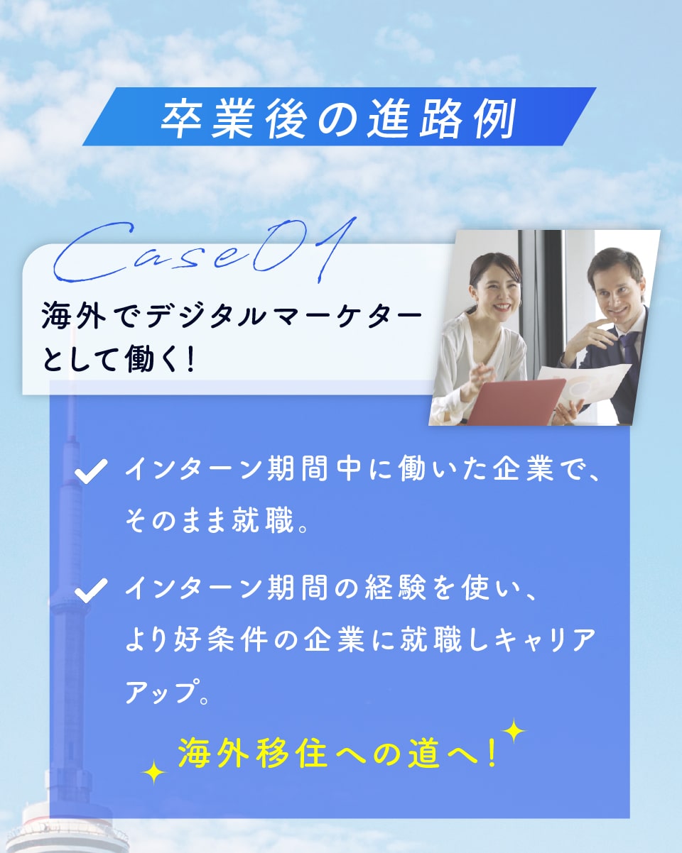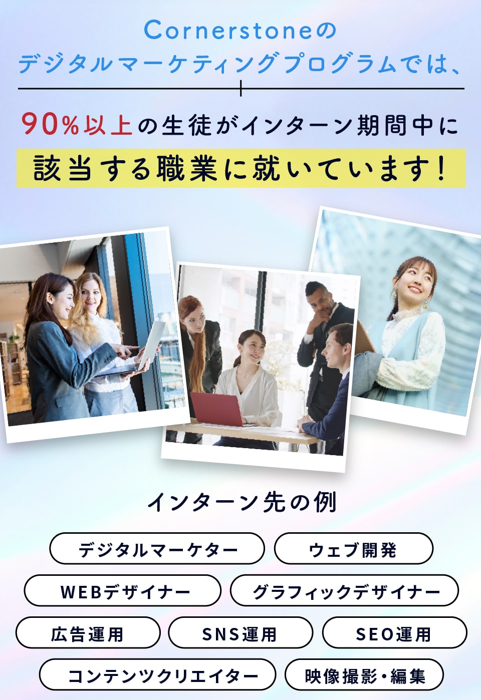 ほとんどの生徒がインターン先を見つけており、基本的には意欲的かつ真面目に取り組んでさえいればお仕事先は必ず見つかります。万が一見つからない時用のセーフティーネットもありますのでご安心下さい。