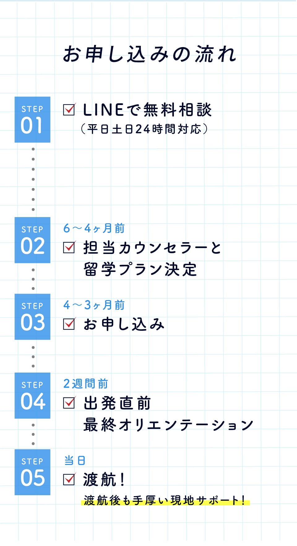 入学日やビザ発給にかかる時間によって左右されますので、まずは無料カウンセリングでご希望をお知らせください。